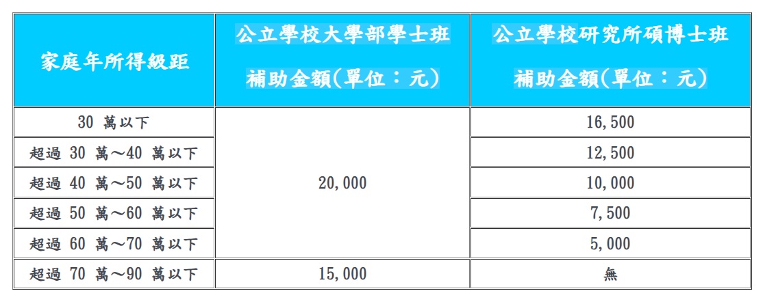 1.大學部學士班學生家庭應計人口年所得新臺幣90萬元以下;研究所碩博士班學生家庭應計列人口年所得新臺幣70萬元以下、