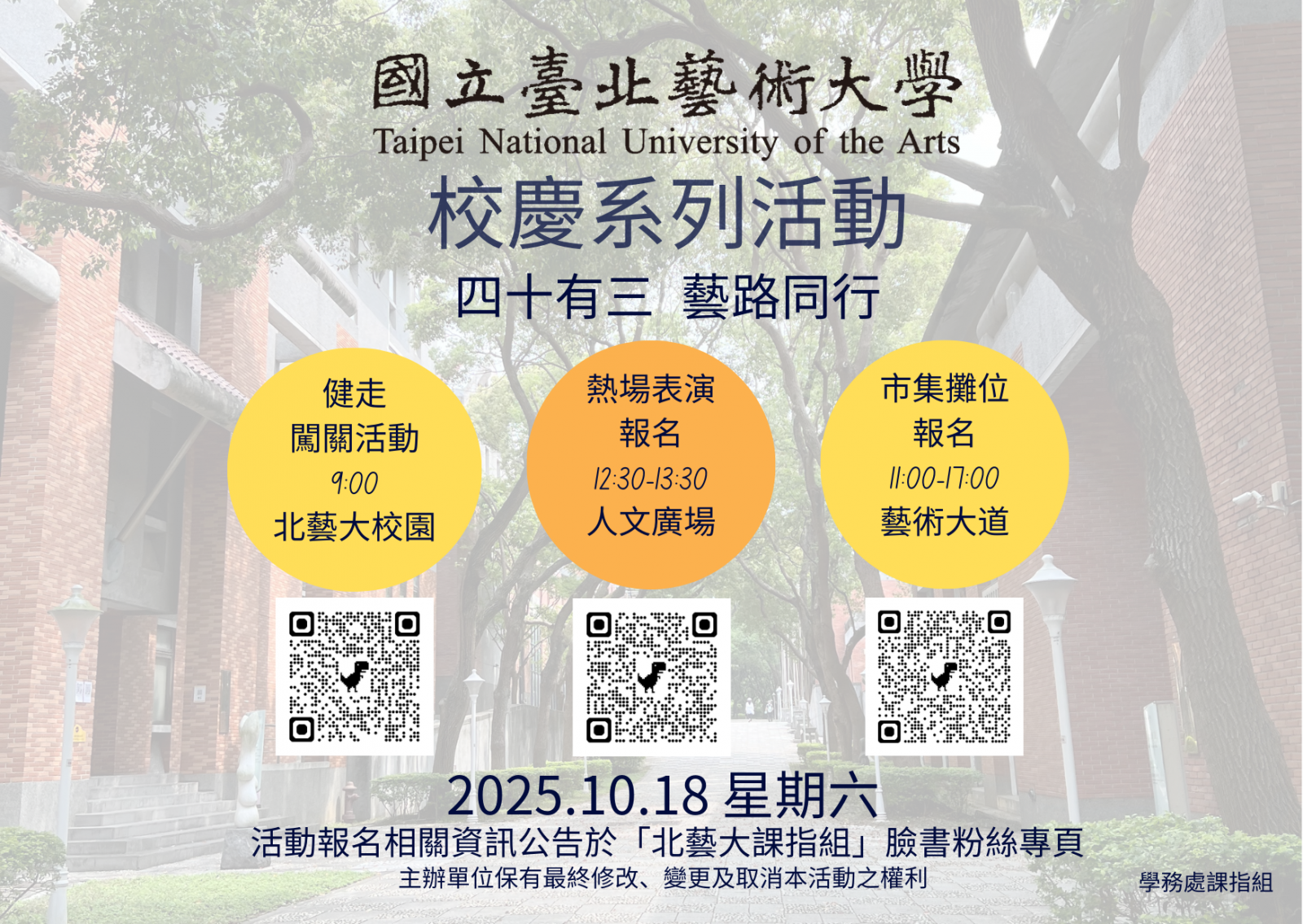 在北藝大的大家庭中,新生與社團承襲前輩們過去的努力與累積,展現對未來的期待,並注入新的活力,帶來精彩的首次亮相。