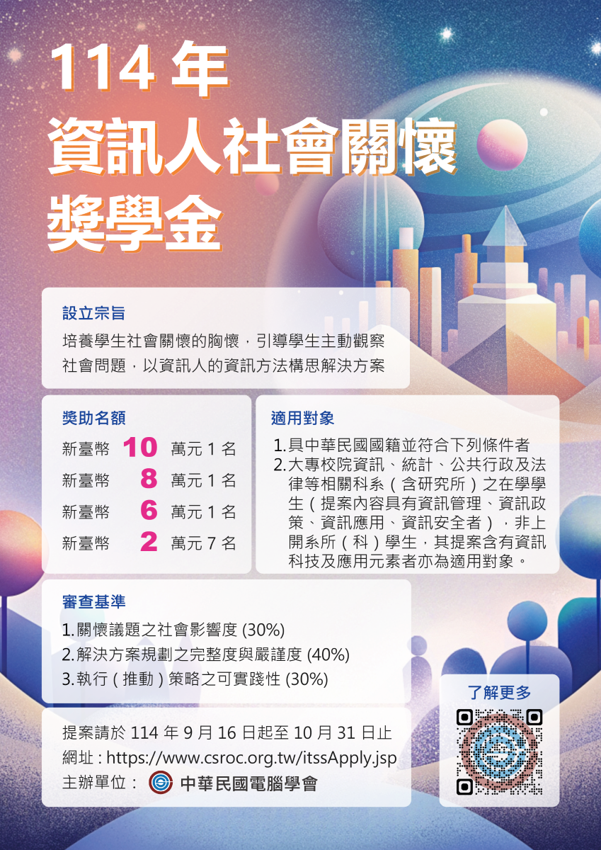 [¼ú§U¾Çª÷]¤¤µØ¥Á°ê¹q¸£¾Ç·|À˰e¡u114¦~«×¸ê°T¤HªÀ·|ÃöÃh¼ú¾Çª÷¡v¬¡°Ê¬ÛÃö¸ê°T¡A¸Ô±¡½Ð°Ñ¦Ò®ü³ø¤º®e¡A½Ð¦P¾Ç¦Û¦æ°e¥ó¡C(2025/09/05)